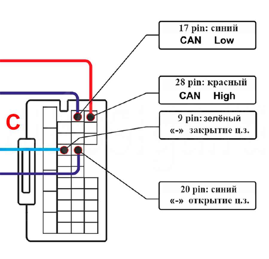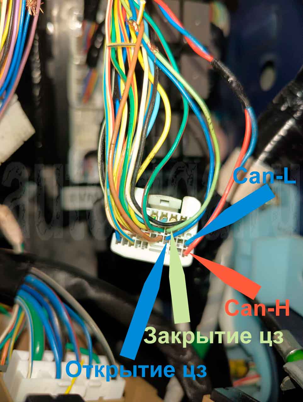 запирание цз (-) – зелёный, отпирание цз (-) – синий, Can-H – красный, Can-L – синий второй снизу разъём (C) BCM