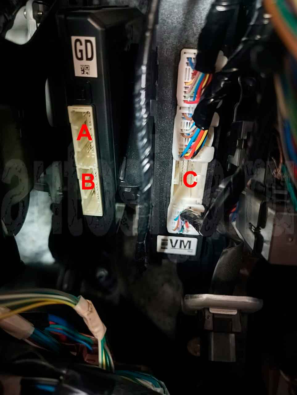 В разъёмах smartkey (A, B) подключаем can, lin и силовые для автозапуска. На BCM (C) – управление центральным замком. На BCM можно и кан подключить.