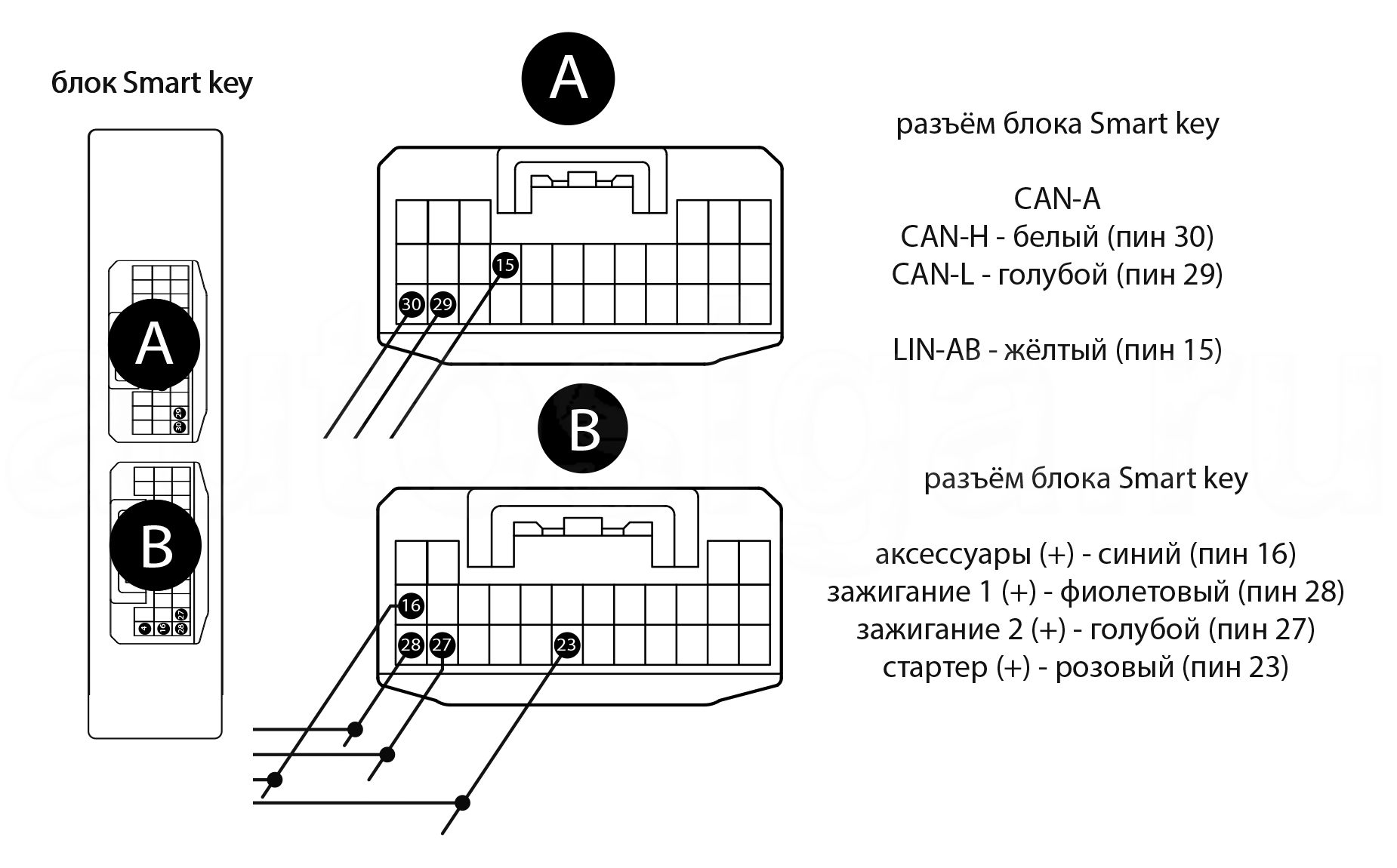 асс (+) – синий, зажигание 1 (+) – фиолетовый, зажигание 2 (+) – голубой, стартер (+) – розовый в нижнем разъёме (B) smartkey