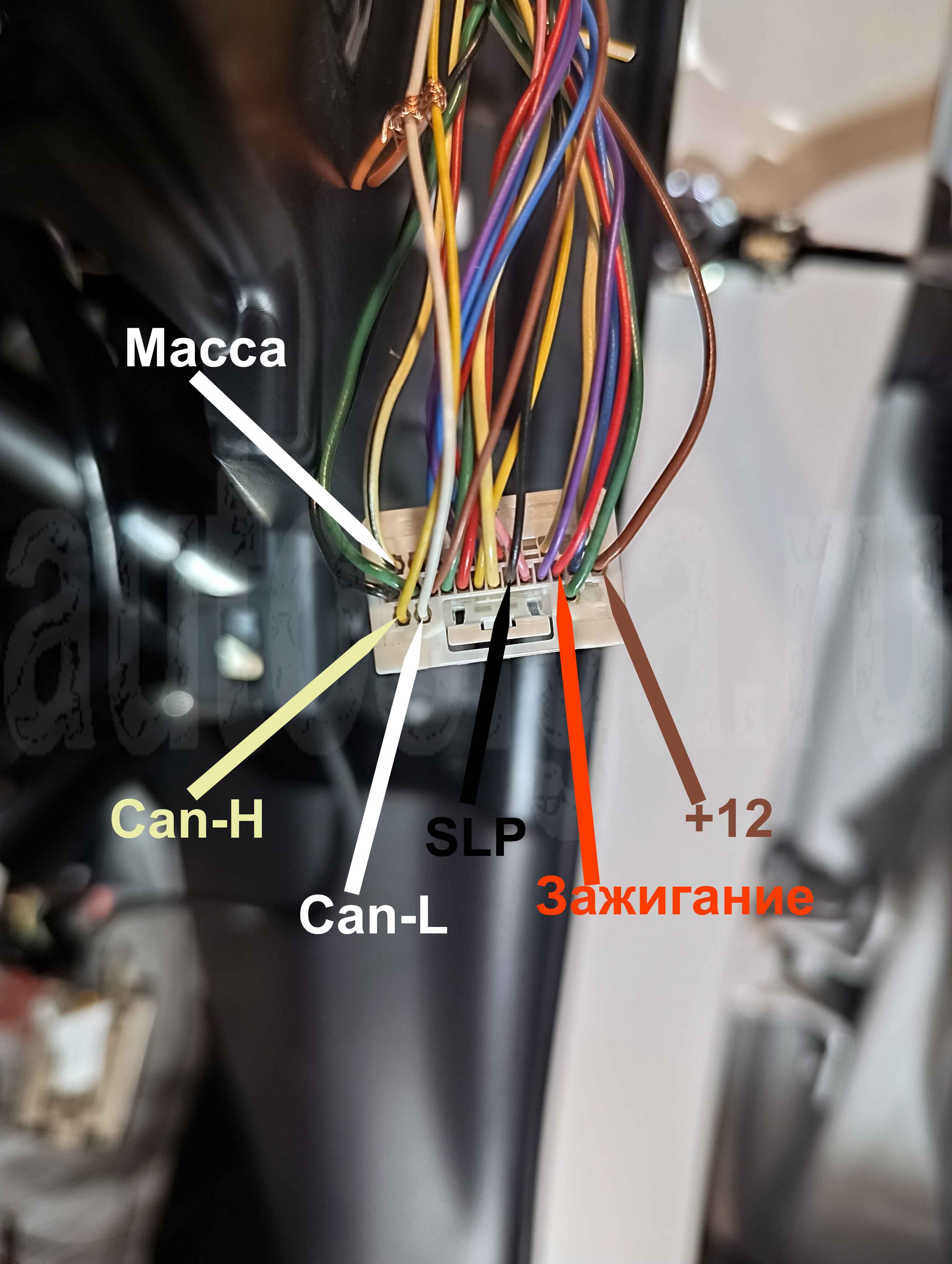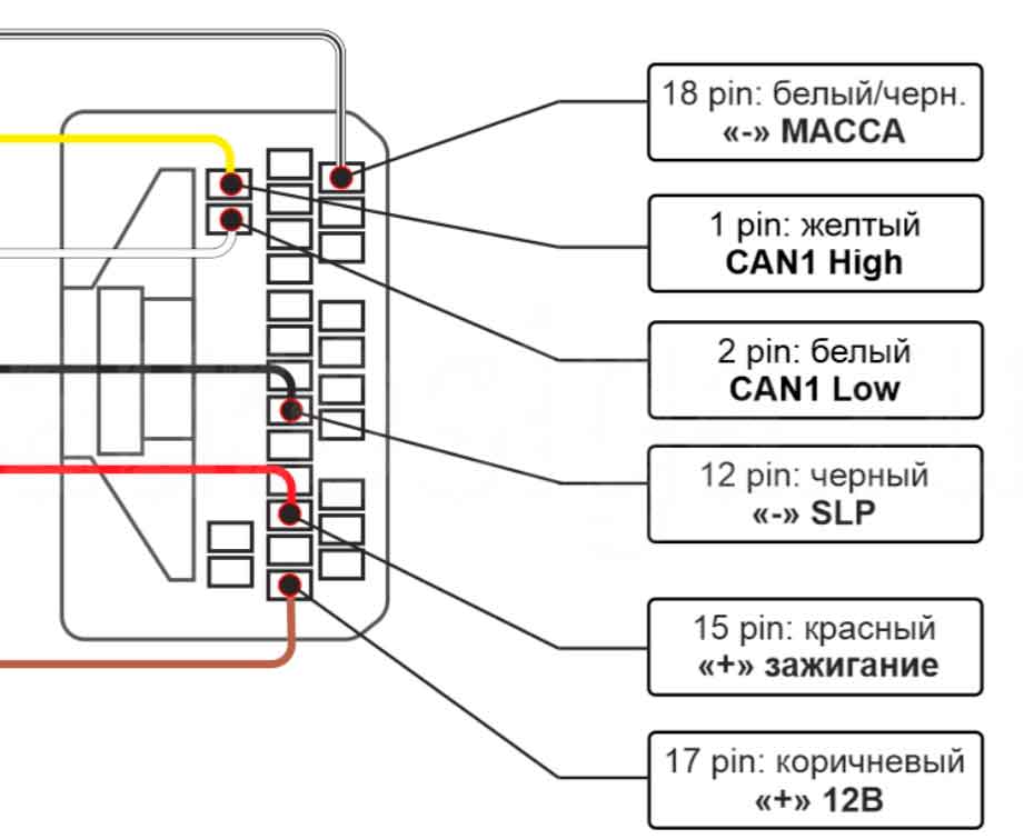 +12 – коричневый, масса – белый/чёрный, Can-H – жёлтый, Can-L – белый, контроль зажигания – красный, slp – чёрный