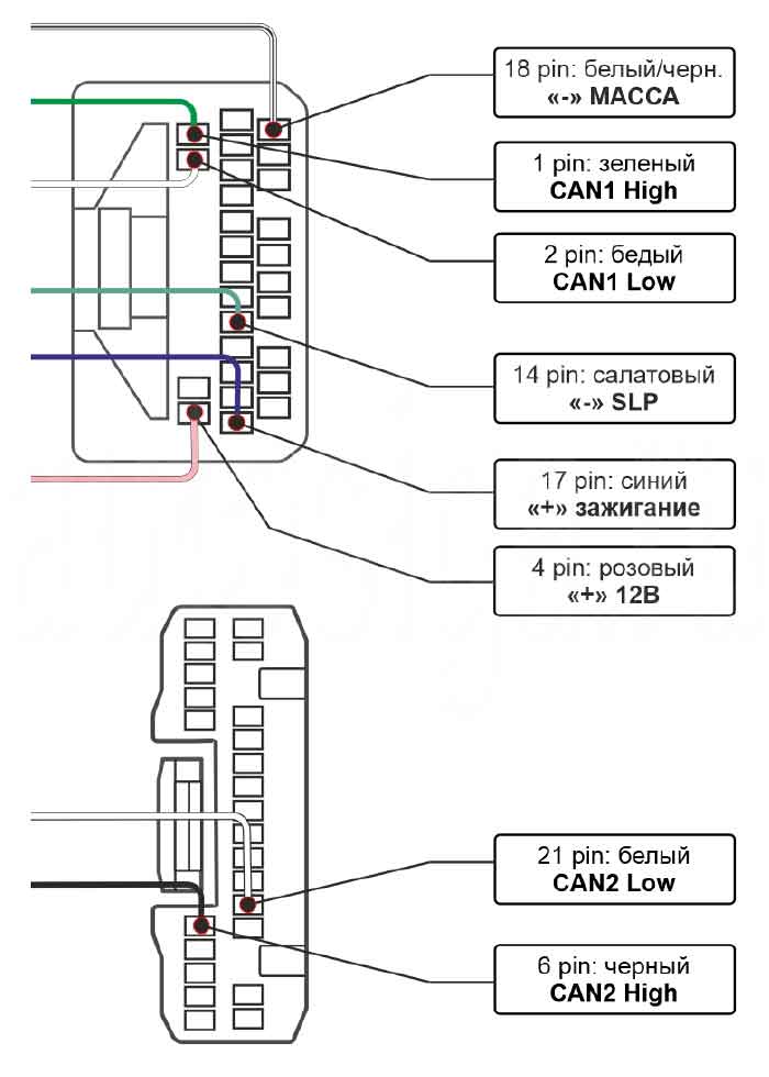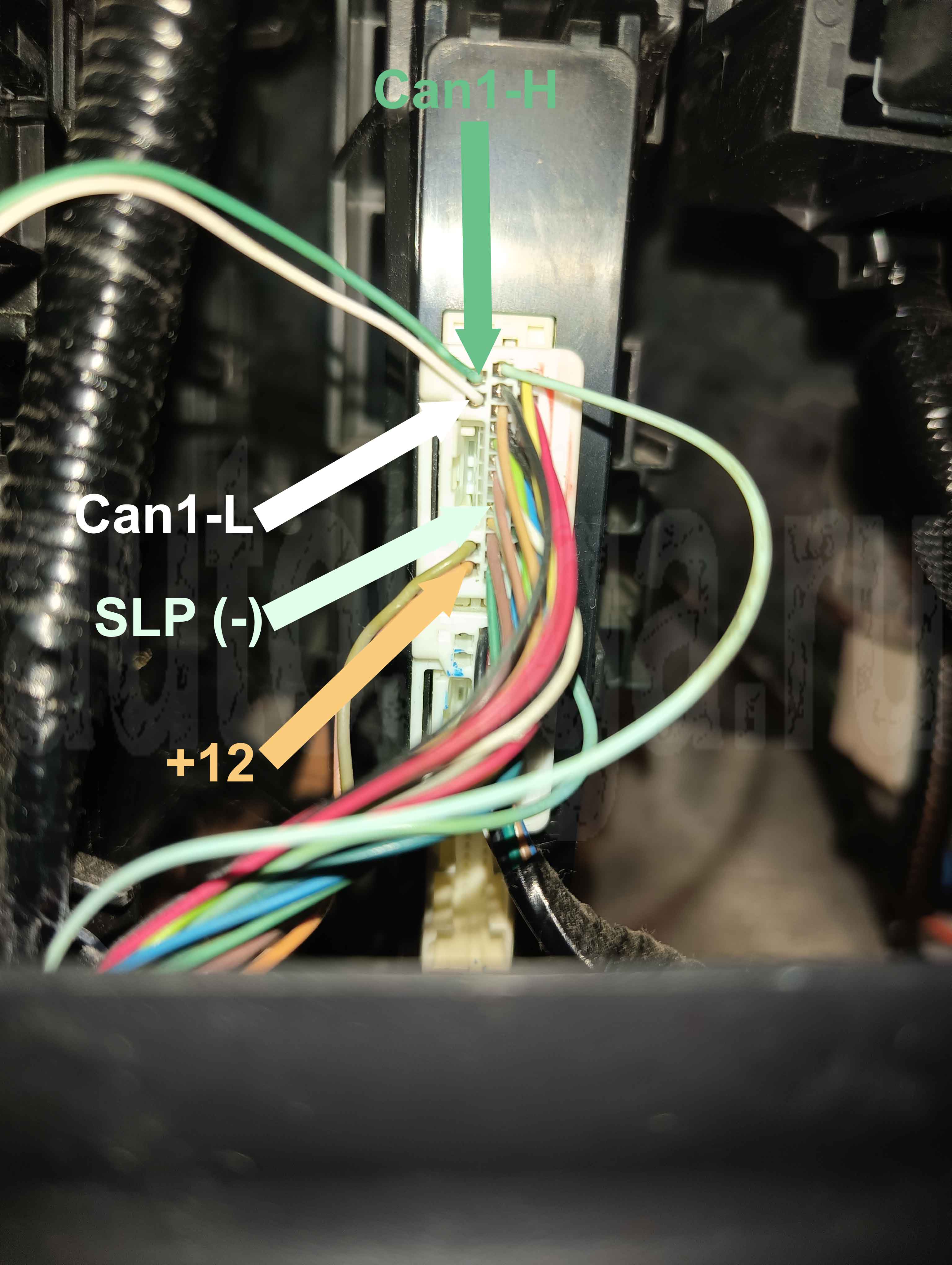 Can1-H – зелёный, Can1-L – белый, SLP – салатовый, +12 – оранжевый в верхнем разъёме блока keyless