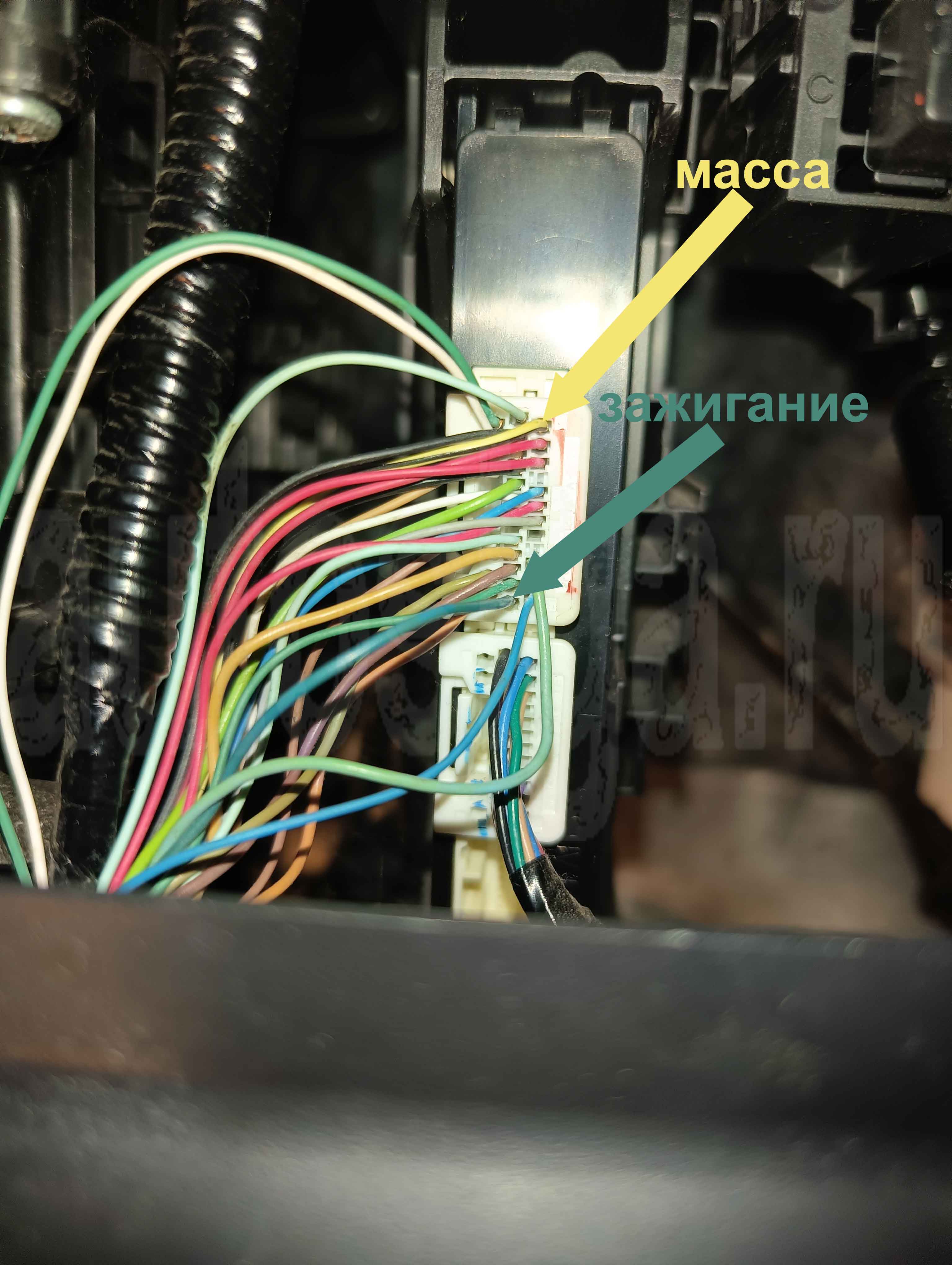 Замок руля (Для Fortin) – зелёный, в жгуте от рулевой колонки. Провода идут с разъёма рамка руля. (См. Фото 1). Подключиться к этим проводам можно около разъёма замка руля. Но что бы от рулевой колонки не тянуть сопли, то можно жгут рулевой колонки вытащить на верх, и там сделать подсоединение.