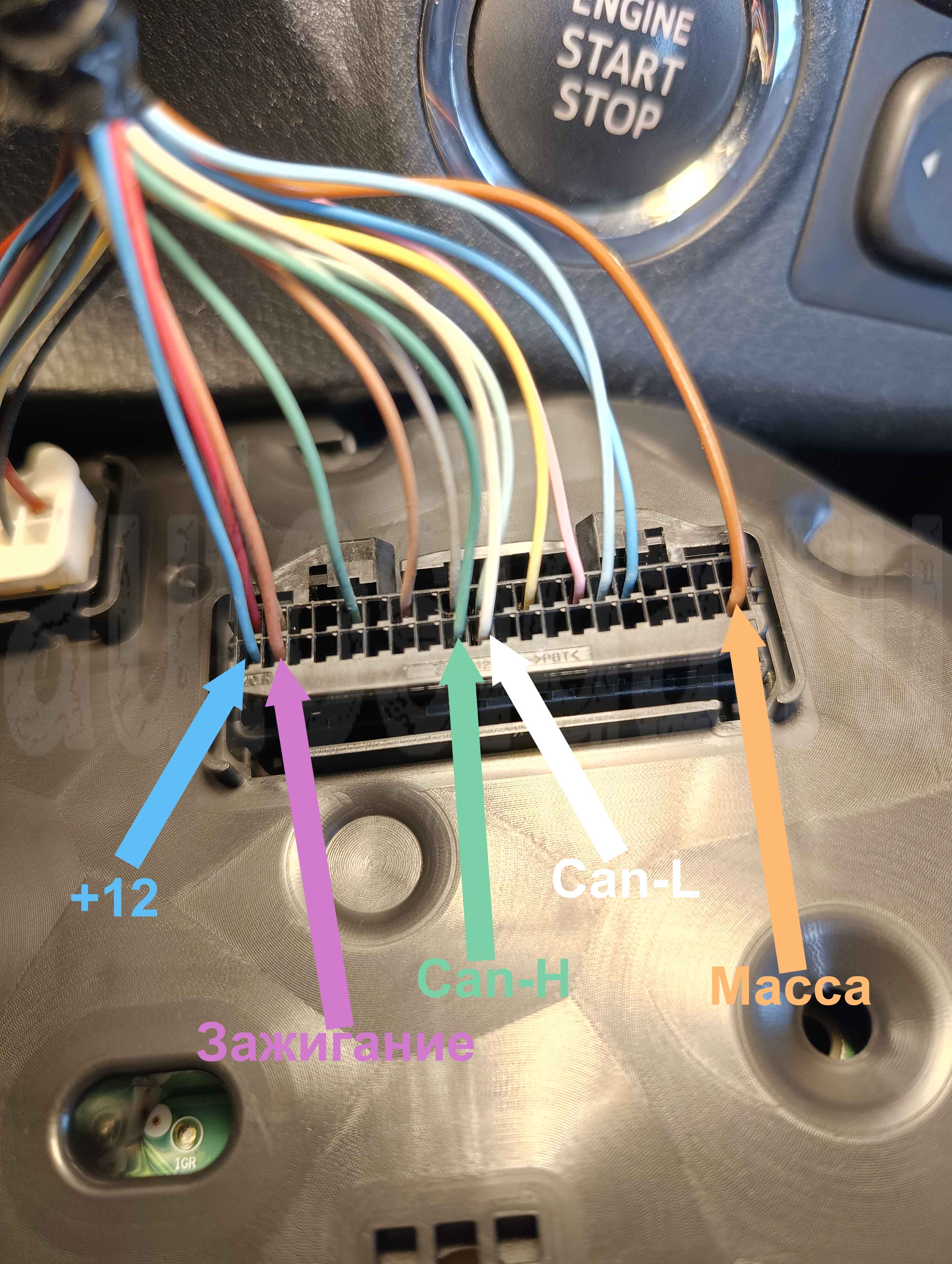 На разъёме панели приборов подключаем питание, can и информацию о включении зажигании.