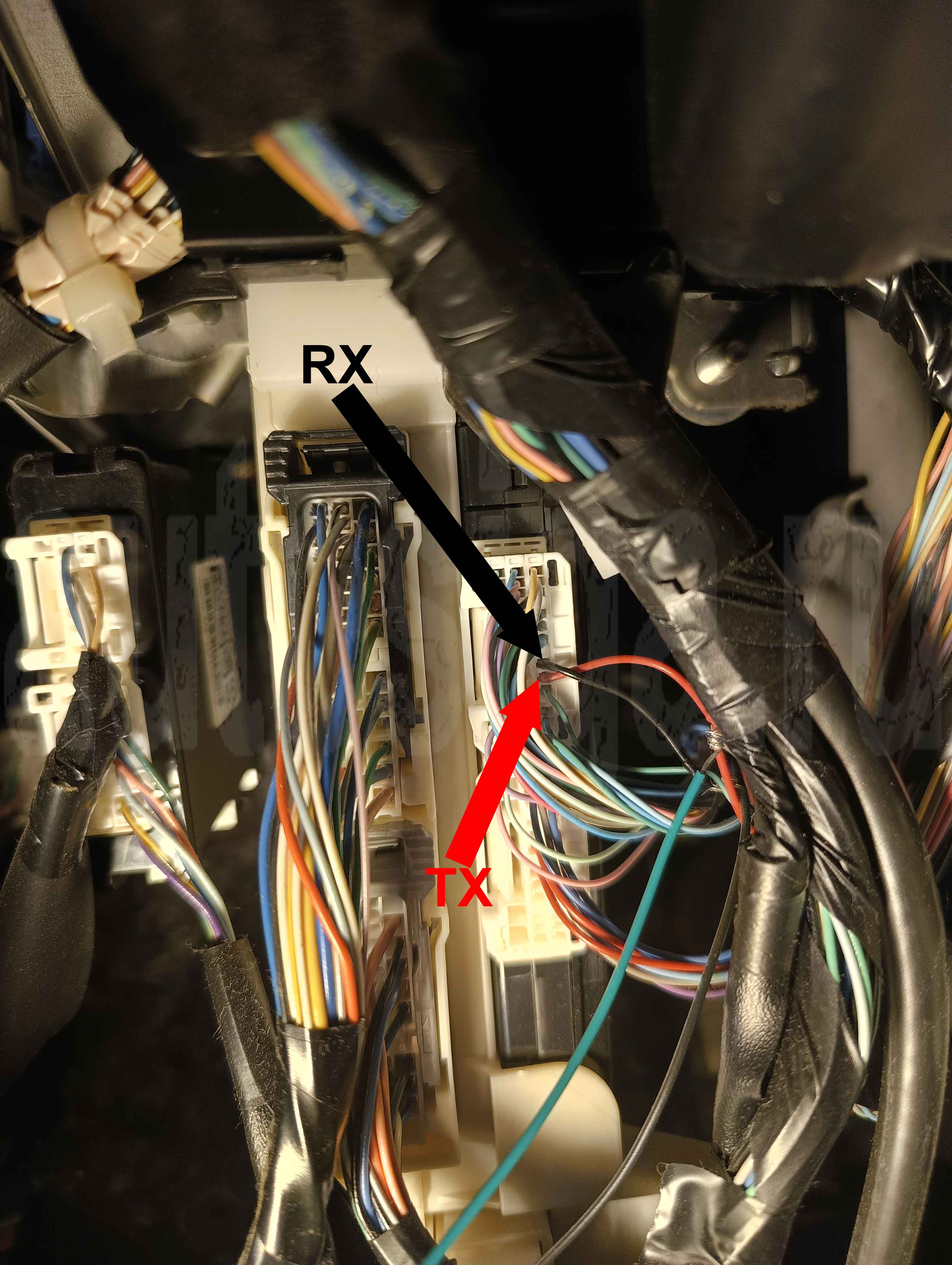 В верхнем разъёме блока BCM за бардачком подключаемся к RX, TX.
